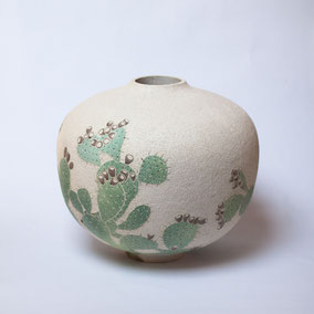 Vaso di grandi dimensioni in grès refrattario bianco, decorato a sgraffito con il motivo floreale della Opuntia Ficus-Indica, una cactacea chiamata comunemente Fico d'India. La decorazione è realizzata a mano ed è naturalmente asimmetrica. L'interno è vetrato e può contenere acqua e fiori recisi. Misure: diametro 32 cm x 28 cm di altezza, apertura 7 cm.