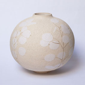 Vaso di grandi dimensioni in grès refrattario bianco, cotto ad alta temperatura, decorato a sgraffito con il motivo floreale della Lunaria, una pianta curiosa per la forma dei suoi frutti. La decorazione, tono su tono, è realizzata a mano ed è naturalmente asimmetrica. L'interno è vetrato e può contenere acqua e fiori recisi. Misure: diametro 30 cm x 30 cm di altezza, apertura 7 cm.