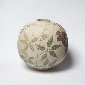 Vaso di grandi dimensioni in grès refrattario bianco, decorato a sgraffito con il motivo floreale della Vite Canadese. La decorazione è realizzata a mano ed è naturalmente asimmetrica. L'interno è vetrato e può contenere acqua e fiori recisi.