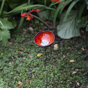 Ciotole in ceramica sospese, ispirate al fiore spontaneo del papavero. Pensati per essere abbeveratoi per insetti, questi piccoli bacini raccolgono l’acqua pluviale. Come il fiore del papavero cresce spontaneamente lungo i margini delle strade o dei campi, queste ciotole disseminate in giardino, come erbe spontanee, possono diventare riserva d’acqua per gli insetti impollinatori, nelle torride giornate d’estate. Foggiate in terra nera, queste ceramiche si compongono di un bacino in terracotta smaltata e di un gambo in ferro naturale. I preziosi pistilli, sono decorati in oro al terzo fuoco. Misurano 10 cm di diametro circa, sono alti 50 cm.