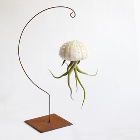 Piccola scultura pensata per accogliere piantine di Tillandsia (Caput Medusae). Viene venduta assieme alla pianta. Composta da un supporto autoportante in ferro arrugginito e trattato, e un guscio in ceramica (colori a scelta: acquamarina, bianco, caffè). Altezza 33 cm circa, la base portante è di 10 cm x 10.
