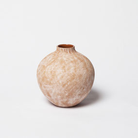 Vaso in terracotta ingobbiata e texturizzata, ispirata ai paesaggi estivi mediterranei. Realizzato al tornio, questo vaso presenta una smaltatura interna che lo rende impermeabile, rendendolo perfetto per contenere acqua e fiori recisi. Il materiale semplice, in armonia con la natura, lo rende perfetto per arredare qualsiasi tipo di ambiente. Misure: 16 cm x 18 cm, apertura 7 cm.
