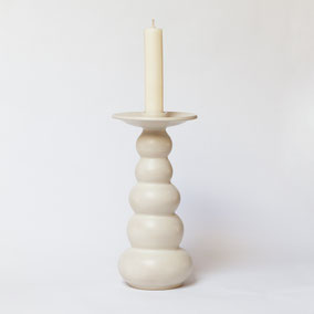 Portacandele da tavolo realizzato al tornio, in grès smaltato ad alta temperatura con finitura satinata bianco sabbia. Composto da una base a sfere sovrapposte e da un piattino con il sostegno per il cero. Misura 29 cm in altezza. 14 cm di diametro il piattino. Pezzo unico.