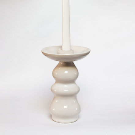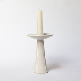 Portacandele da tavolo realizzato al tornio, in grès smaltato ad alta temperatura con finitura lucida bianco avorio. Composto da una base a cono e da un piattino con il sostegno per il cero.