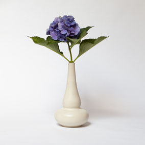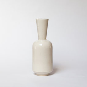 Vaso per recisi realizzato al tornio, in grès smaltato ad alta temperatura con finitura satinata bianco sabbia. Misura 22 cm in altezza per 11 cm di diametro alla base. La sua caratteristica forma a due livelli ricorda le antiche lampade a petrolio.