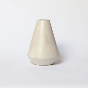 Vaso per recisi realizzato al tornio, in grès smaltato ad alta temperatura con finitura satinata bianco sabbia del cono, a contrasto con il bianco lucido della base. Misura 21 cm in altezza per 14 cm di diametro alla base, la bocca del vaso è di 4 cm di diametro.
