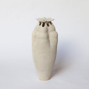 Vaso in grès bianco refrattario, smaltato e cotto ad alta temperatura. Ispirato alla "scatola porta semi" del fiore di Papavero. Misura 30 cm in altezza, 10 cm di diametro circa. Pezzo unico.