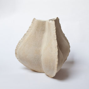 Vaso in grès bianco refrattario, smaltato e cotto ad alta temperatura. Ispirato alla "scatola porta semi" dell'Iris. Misura 35 cm di altezza circa per 36 cm di larghezza. Pezzo unico.
