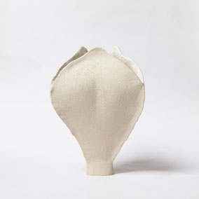Vaso in grès bianco refrattario, smaltato e cotto ad alta temperatura. Presenta una finitura materica color avorio all'esterno e una bianca e lucida all'interno. Ispirato alla "scatola porta semi" dell'Iris. Misura 31 cm in altezza, 22 cm di larghezza. Pezzo unico.