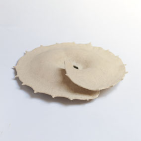 Vaso in grès bianco refrattario, smaltato e cotto ad alta temperatura. Ispirato alla "scatola porta semi" del Medicago Orbicolare, una pianta originaria del Medioriente. Misura 26 cm di diametro per 12 cm di altezza circa. Pezzo unico.