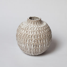 Vaso per fiori recisi rivestito di vetro bianco. Realizzato in terra refrattaria nera che emerge dalla finitura vetrosa creando delle caratteristiche puntinature ruggine. La texture della trama intagliata sulla sua superficie rende questo pezzo ceramico particolarmente mosso e vivo. Misura 20 cm di altezza, 16 cm di diametro e 5 cm l’apertura superiore.