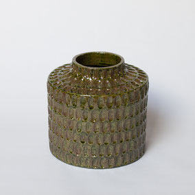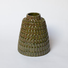 Vaso per fiori recisi rivestito di vetro trasparente color verde oliva cangiante. La trasparenza dello smalto vetroso, mette in evidenza la matericità della terra refrattaria con cui è stato realizzato. La texture della trama intagliata sulla sua superficie rende questo pezzo ceramico particolarmente mosso e vivo. Misura 20 cm di altezza, 16 cm di diametro alla base e 13 cm alla sommità, 6 cm l'apertura superiore. Pezzo realizzato interamente a mano.