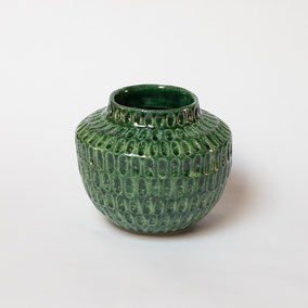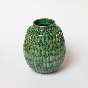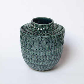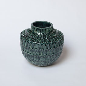 Vaso per fiori recisi rivestito di vetro trasparente colorato. La trasparenza dello smalto vetroso, mette in evidenza la matericità della terra refrattaria con cui è stato realizzato. La texture della trama intagliata sulla sua superficie rende questo pezzo ceramico particolarmente mosso e vivo. Può essere utilizzato anche come sottovaso. Misura 18 cm di altezza, 21 cm di diametro e 9 cm l'apertura superiore. Disponibile in verde petrolio e verde bottiglia.