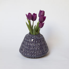 Vaso per fiori recisi rivestito di vetro trasparente color lavanda. La trasparenza dello smalto vetroso, mette in evidenza la matericità della terra refrattaria con cui è stato realizzato. La texture della trama intagliata sulla sua superficie rende questo pezzo ceramico particolarmente mosso e vivo. Misura 22 cm di altezza, 24 cm di diametro e 12 cm l’apertura superiore. Pezzo realizzato a mano.
